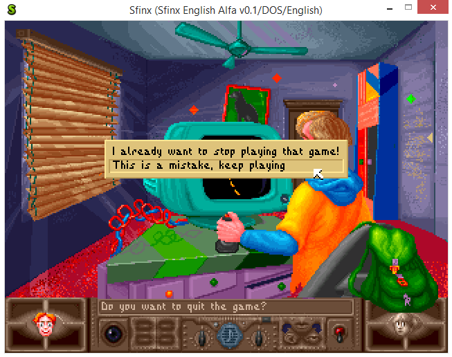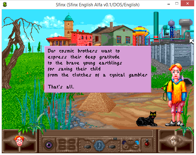 At last, but not least, the English translation is complete as well. Many thanks goes to Arnaud for this! Currently, Thierry is trying to improve it, so hopefully we can leave the "Alfa v0.1" tag from the ribbon of the ScummVM window soon. ;)