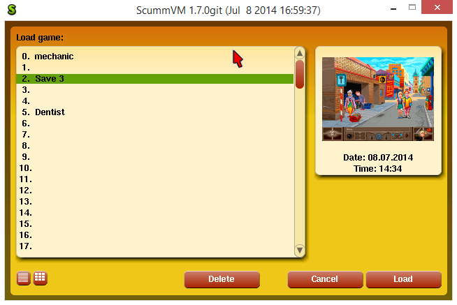 I've got a couple of hardships during the implementation of this subsystem, but ScummVM's built-in Common::Serializer class helped me a lot and spared me a great deal of time by hiding the actual stream operations behind an abstract interface. Since the original game only supports saving when exiting the game, and loading when starting it, I had to make so modifications in the engine itself to make it possible to save/load anytime during gameplay. But knowing the internal workings of the engine, it was quite straightforward. The hardest part was to rework Spare and the way it's used, so now it's not just a temporary container for some of the sprites in the game, but a big catalog, which stores every Sprite used by the engine, all the time, so most of the synchronization work is to keep Spare up to date.